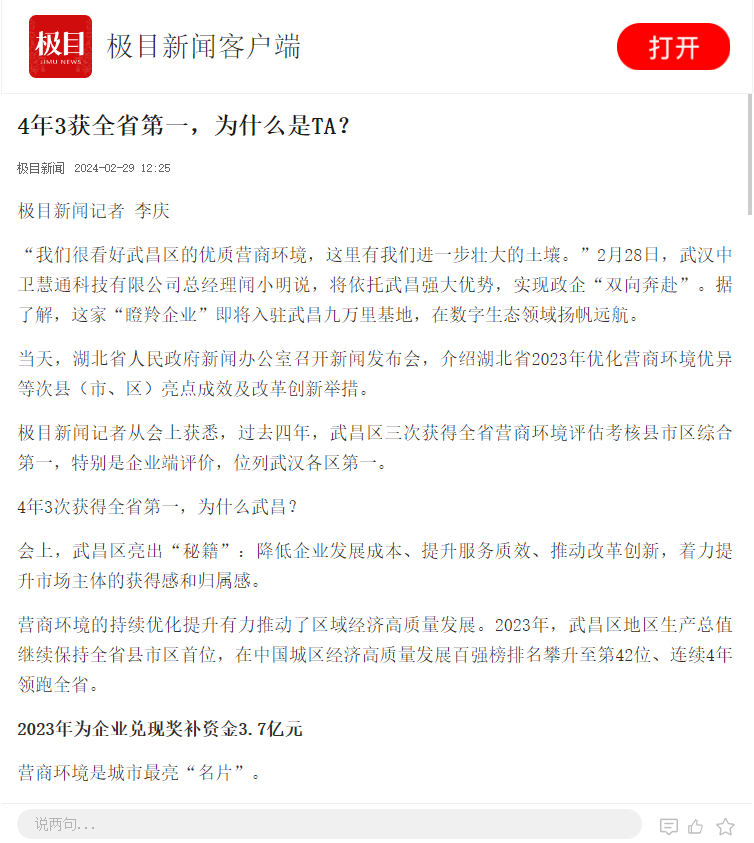 武昌区2023年度取得的综合成绩受到人民网、新华网、央广网、湖北日报、长江日报、极目新闻等媒体的广泛关注,并登上百度热搜同城榜第三。
