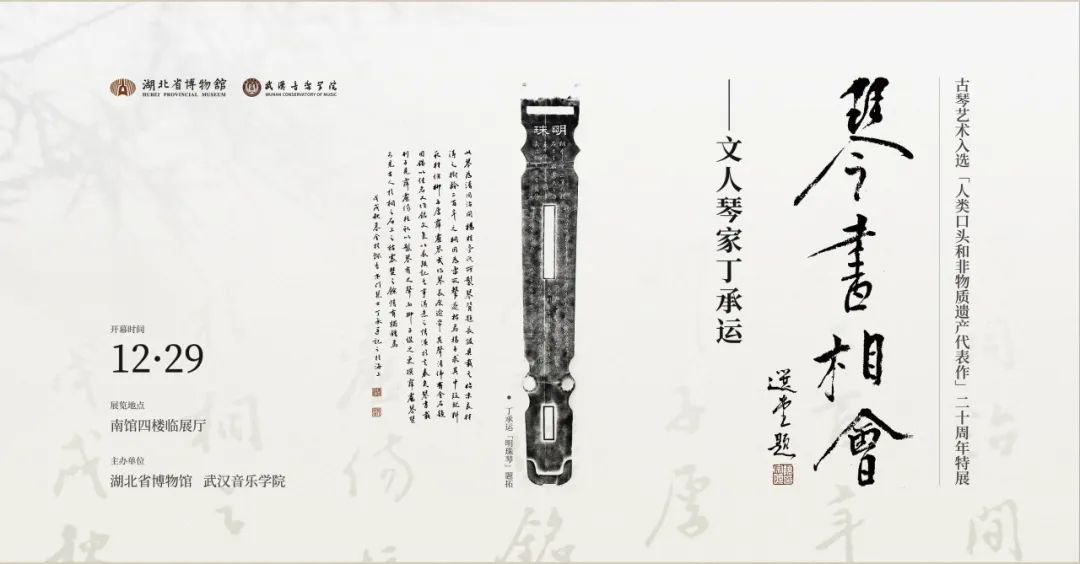 为纪念中国古琴艺术入选“人类口头和非物质遗产代表作”二十周年,湖北省博物馆和武汉音乐学院联合举办此展。展览多方位展示丁承运先生生活的不同侧面,呈现丁承运的琴瑟艺术阐发的金石声韵和书法作品释放的魏晋风骨。