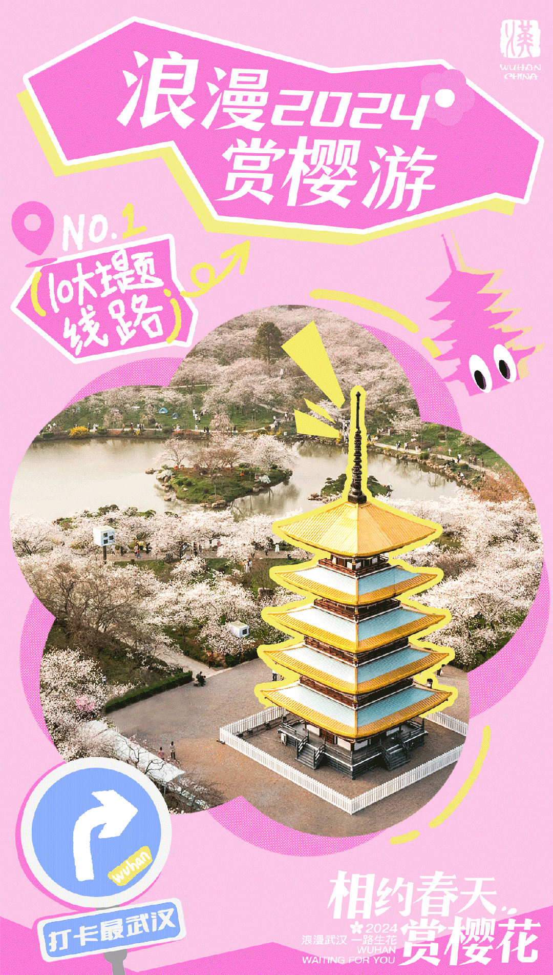 「武汉大学」坐拥樱花城堡、樱花大道;「东湖樱花园」是世界三大赏樱胜地之一;「晴川假日酒店」的樱花与江景同框……