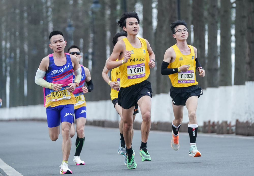 3月24日,中国选手杨定宏(左二)在比赛中。他以2小时12分06秒的成绩成为全程马拉松男子组首位冲线的中国选手。新华社记者 肖艺九 摄