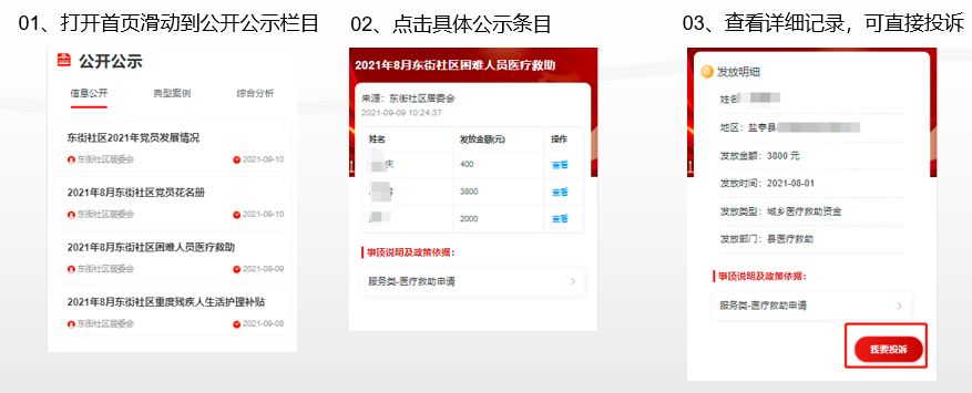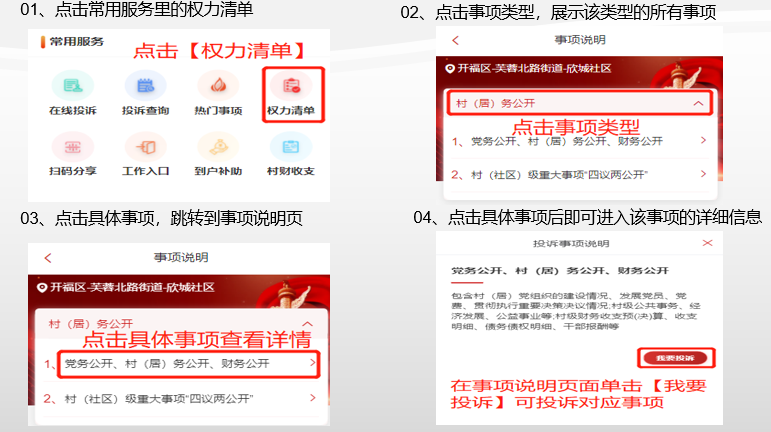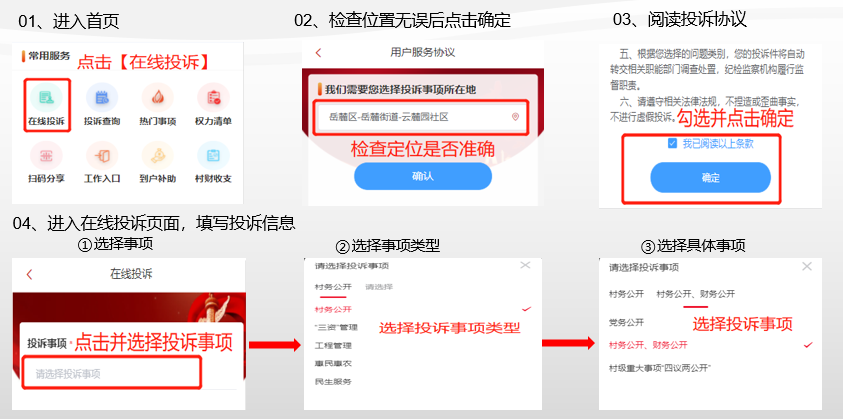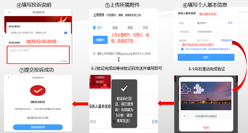 进入首页检查位置阅读在线须知选择事项清单填写投诉说明上传附件信息填写个人基本信息获取短信验证码提交成功。
