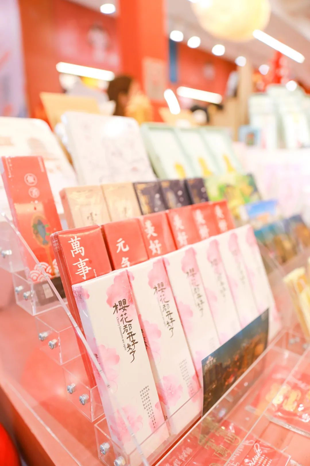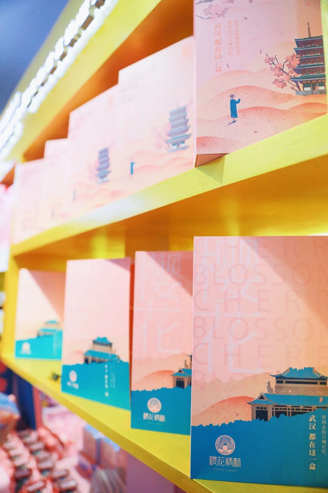 店里货架上放满了樱花饼、樱花棒棒糖、樱花曲奇、樱花酒等至少上十种樱花美味。去年春季上新的一款黄鹤楼造型的樱花饼,小巧精致,格外引人注目。今年店里将上新一款樱花茶饼,让我们拭目以待。