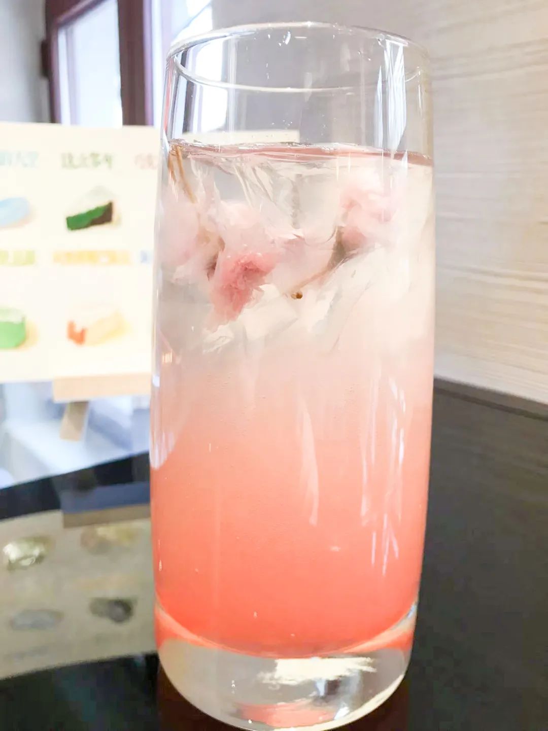 樱花芭乐气泡水,淡淡樱花风味配合芭乐果味叠加层次,口味清爽。樱花花瓣融入气泡水中出品,阳光下超出片。