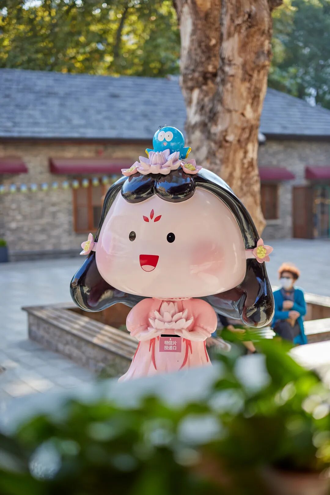 邮局门口穿着粉色衣服的“小昙昙”,手里捧着一朵昙花,十分萌趣可爱,仔细看会发现其实这是一个特别的邮筒,可以投递信件、明信片,有种“从前车马慢”的悠然感。