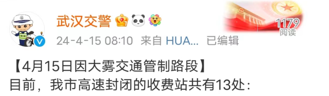 武阳高速光谷南、红莲湖南收费站入口临时管制;武汉绕城高速施岗、阳逻、花山、凤凰山、江夏、武汉南、金口收费站入口临时管制。