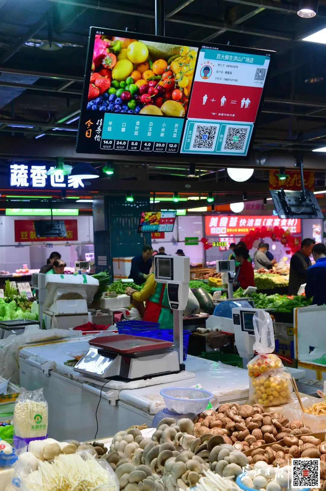 每家商户都使用智能秤,摊位上方的显示屏显示商户的实名信息和收款二维码等内容。
