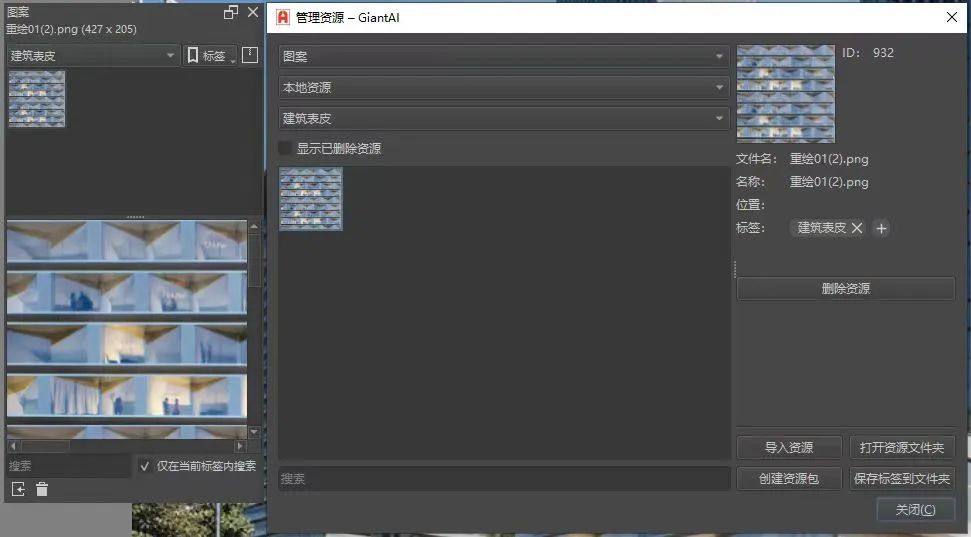 打开一张写字楼效果图,用笔刷工具将玻璃幕墙标红,随即弹出可供选择的“表皮库”,涵盖了全球最新最潮的幕墙范式,可一键替换、精准修改。