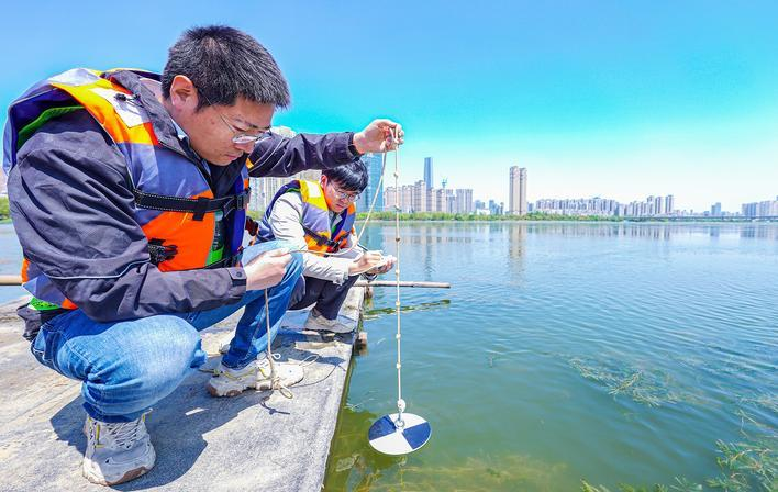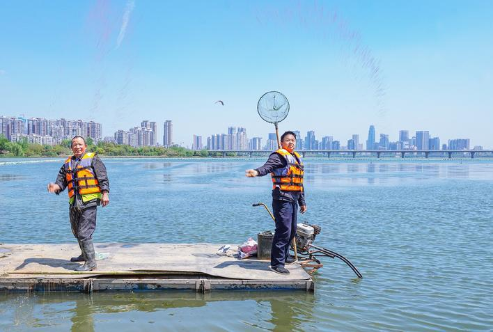 湖面上,维护作业船正在忙碌着,工人在水草繁茂区收割水草,在水草覆盖度较低的水域播撒水草籽;湖泊巡查人员时不时拿出透明度盘测量水体透明度。外沙湖养护工作,繁忙而有序。