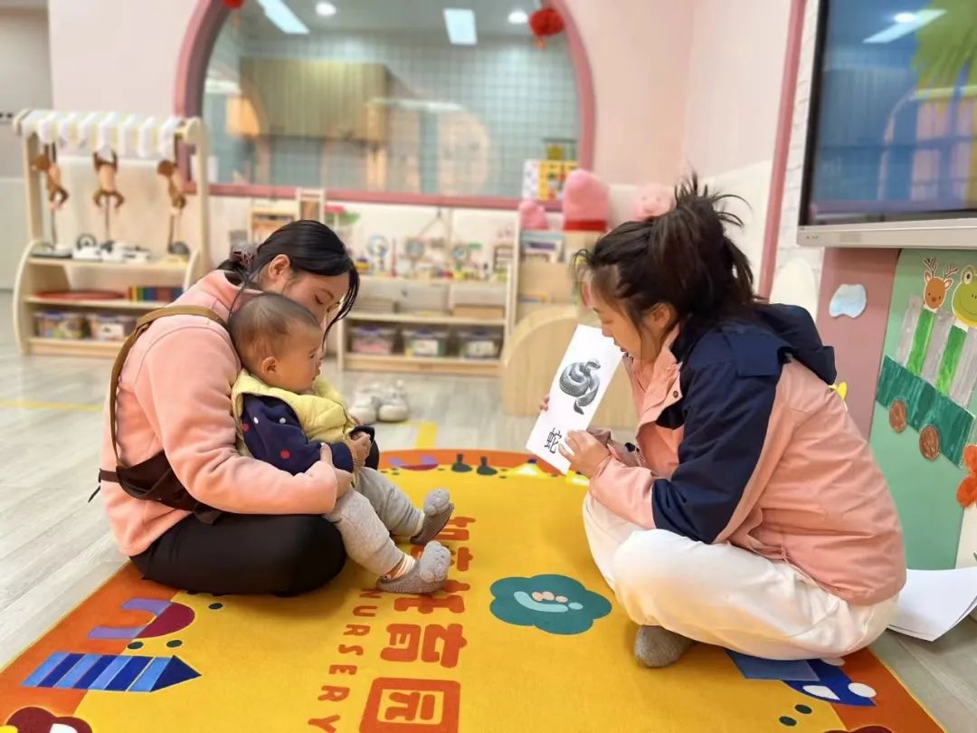 “这个是大象,这个是小兔子,这个是小狗……”近日,阳光明媚的早晨,在武昌区知音托育园乳儿班内,育婴师正拿着闪卡与圆圆宝宝互动,绘声绘色的讲解引得宝宝咯咯大笑。早在圆圆刚一岁时,就来知音托育园里参加体验活动并报名乳儿班。