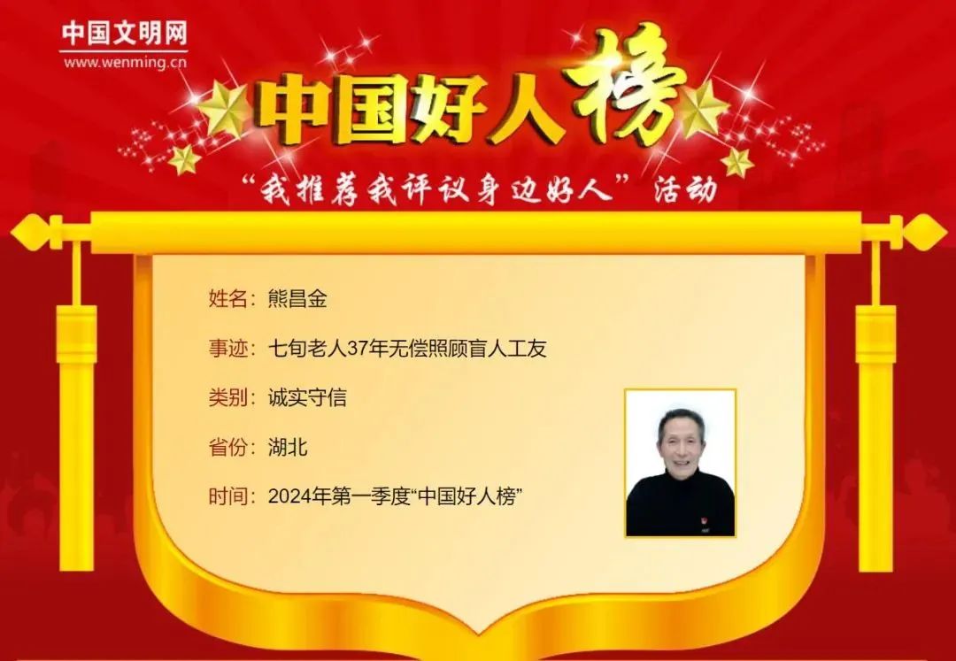 从风华正茂到白发苍苍,从上班到退休,熊昌金坚持照料着熊光林的生活出行,像“眼睛”一样给熊光林带来光明。熊昌金曾荣获荆楚楷模、武汉市道德模范等荣誉称号。