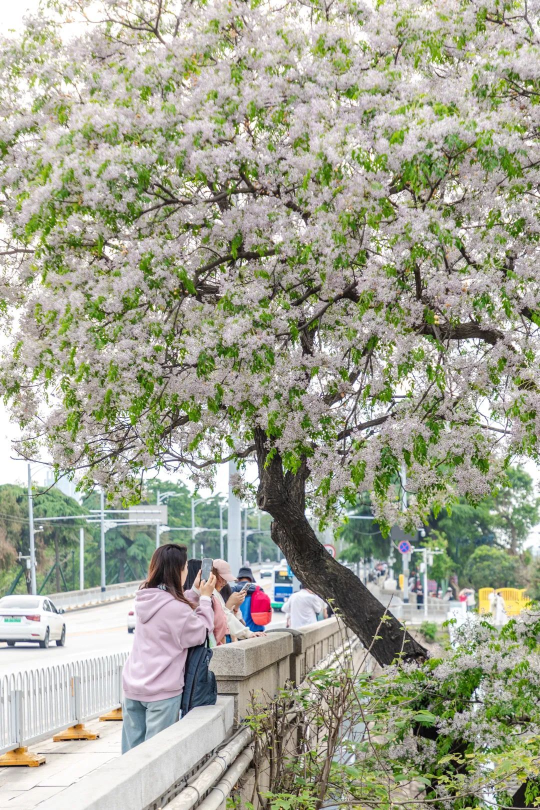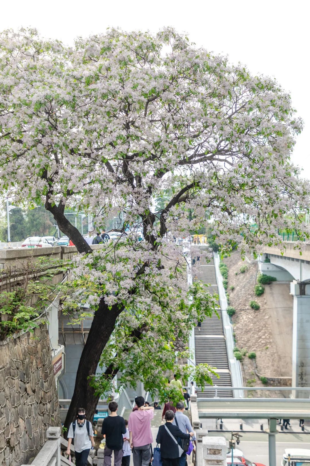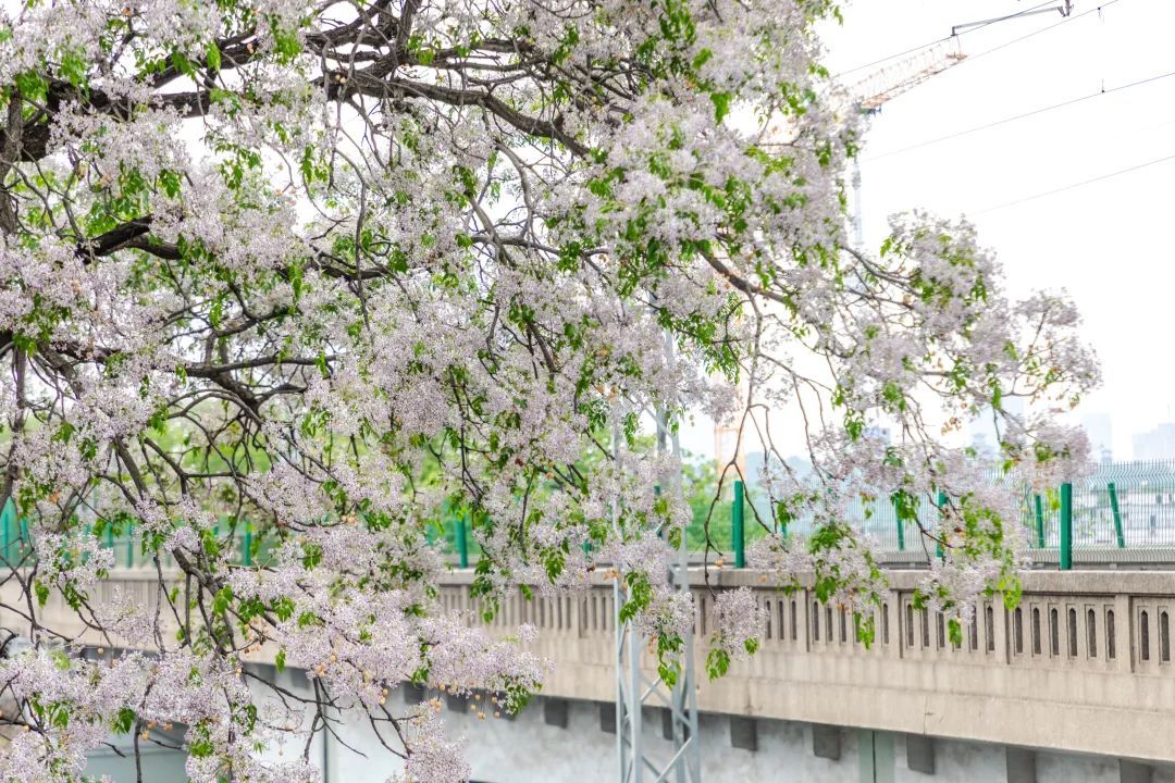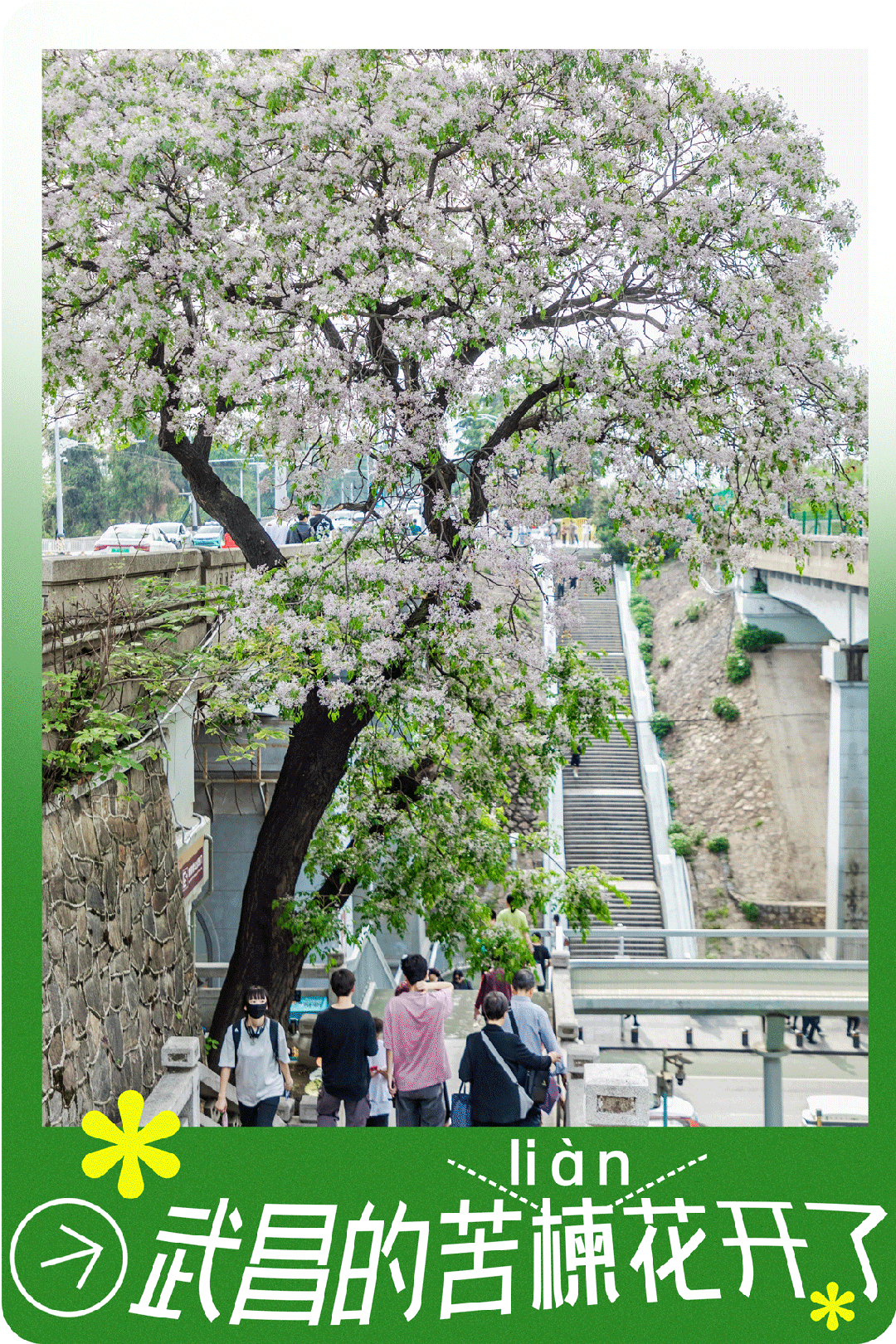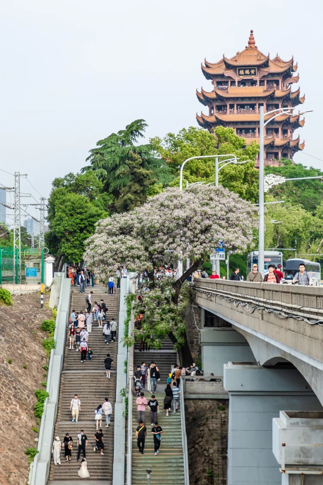 ????黄鹤楼西门(司门口天桥上长江大桥处)就有一株盛开的苦楝,是黄鹤楼绝美打卡地之一。