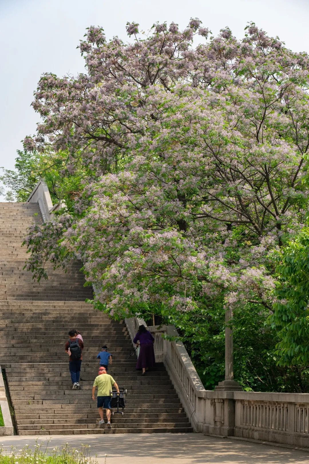 ????武汉长江大桥建成纪念碑平台处,也有几株盛开的苦楝,既可以打卡雄伟的长江大桥,亦可在花香中一览长江美景。