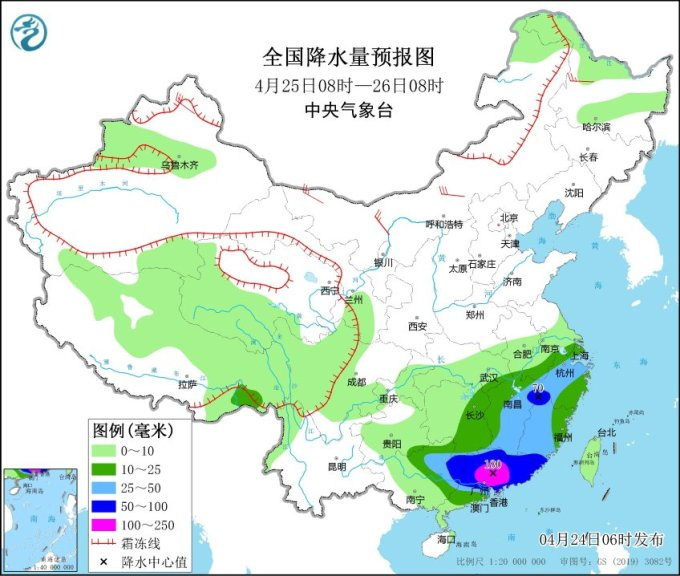 特别是明天(25日),是本轮强降雨的最强时段,广西东北部、广东中北部等地部分地区有暴雨或大暴雨(100-180毫米);后天起(26日),强降雨范围收缩。