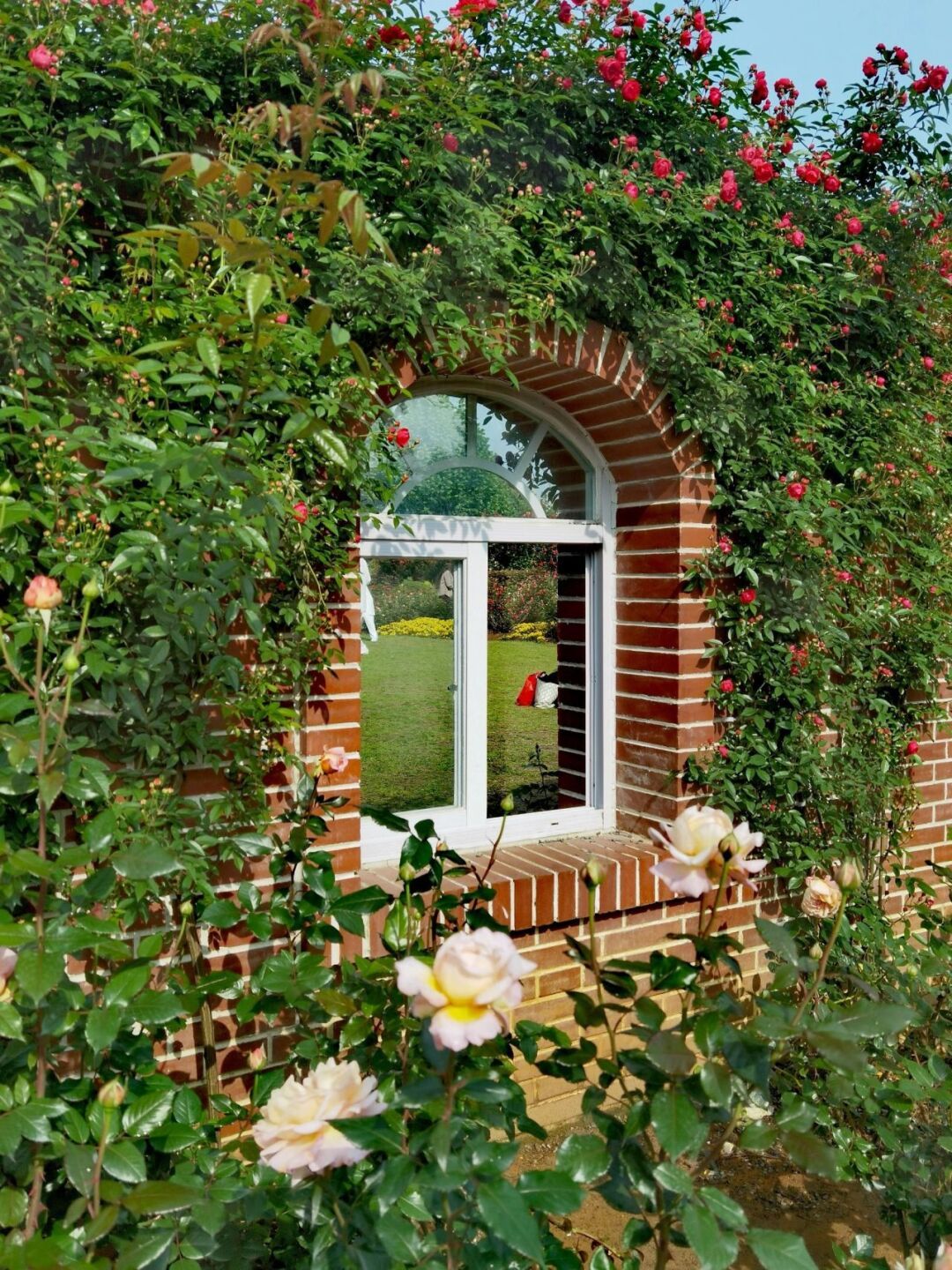 颜色各异的大朵月季,团团簇簇、婀娜摇曳,坐在这里,就像爱丽丝般坠入梦中漫游仙境。