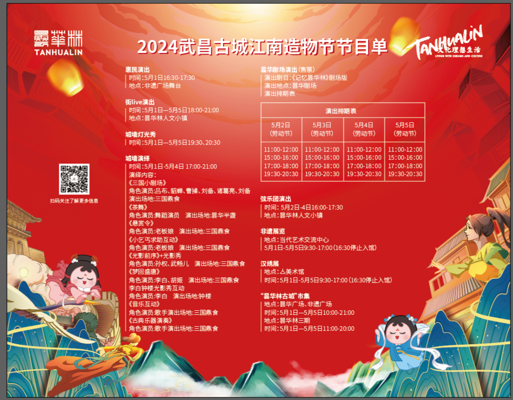 昙华林手绘导览地图和2024武昌古城江南造物节表演演出时间表如下,来昙华林的朋友们可以收藏一份哦!