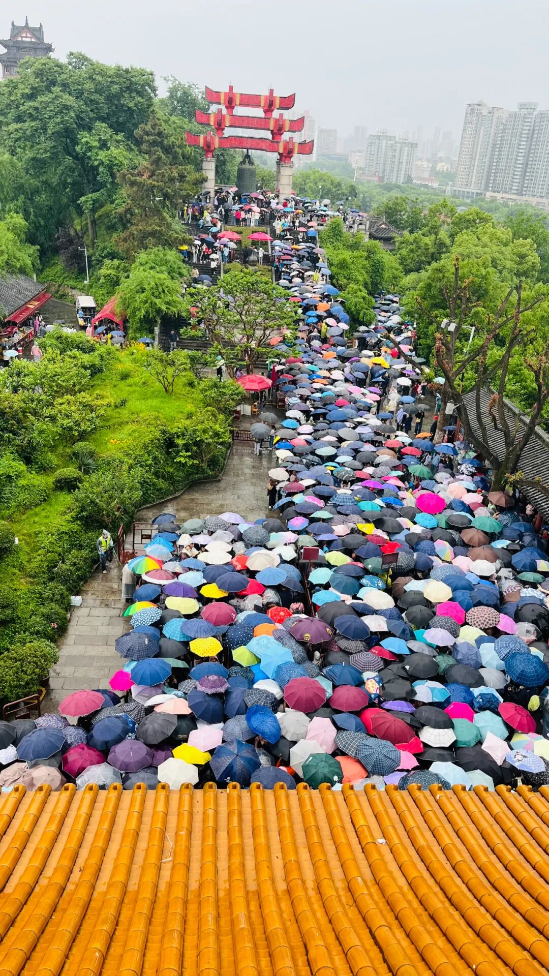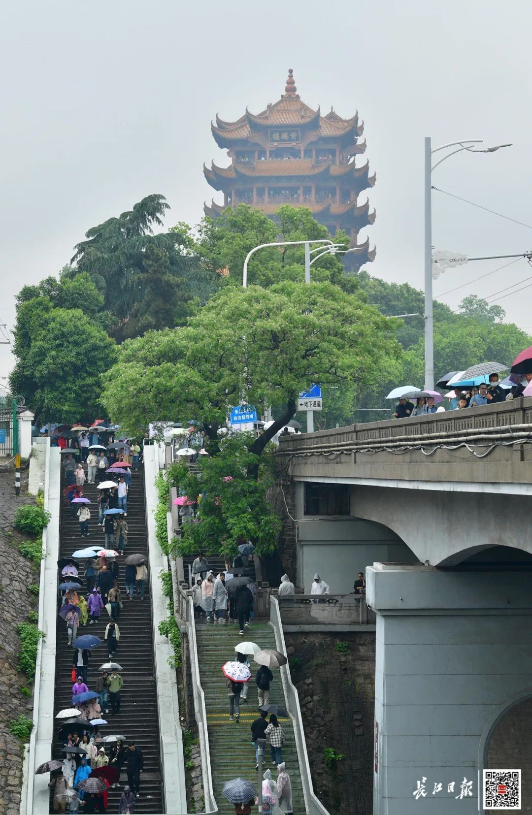 游客打着雨伞排队登黄鹤楼。通讯员姚媛媛