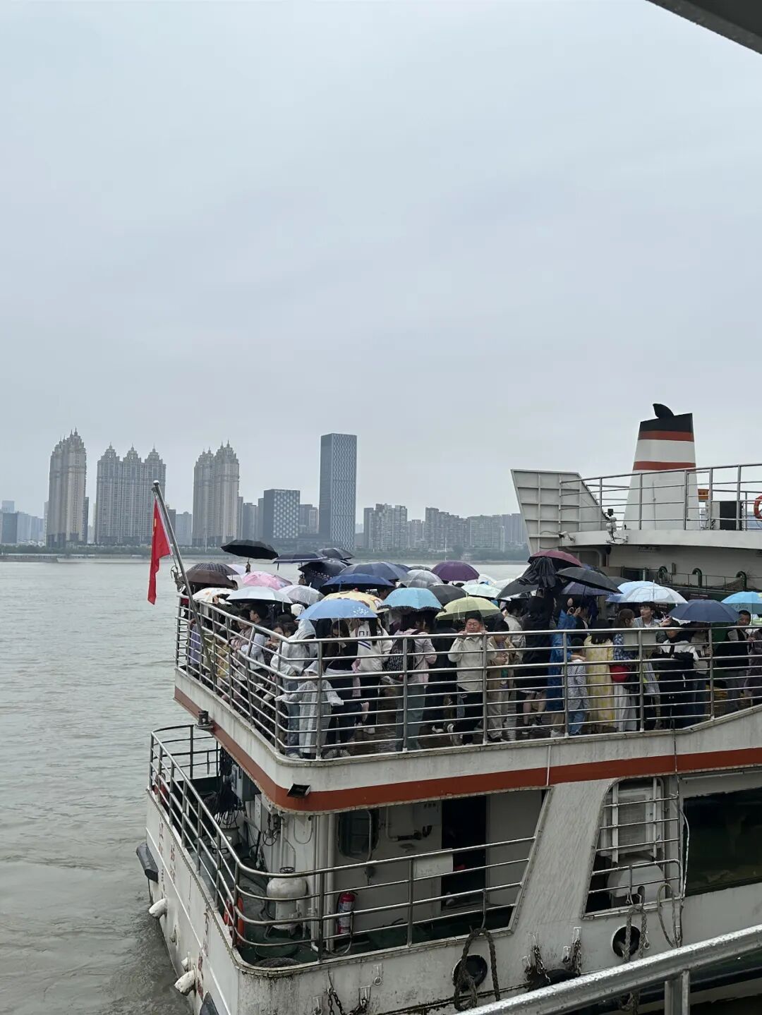 游客打着雨伞游长江。
