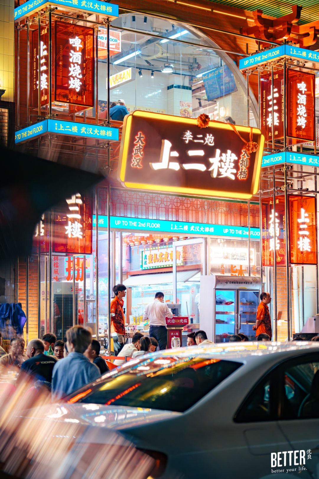 李二炮·上二楼大排档在装修时就决定要成为整条街“最亮的仔”,整体装修不仅以暖色调为主,还用牌匾和发光灯箱作为装饰,头顶“武汉大排档”五个字,江湖气十足。