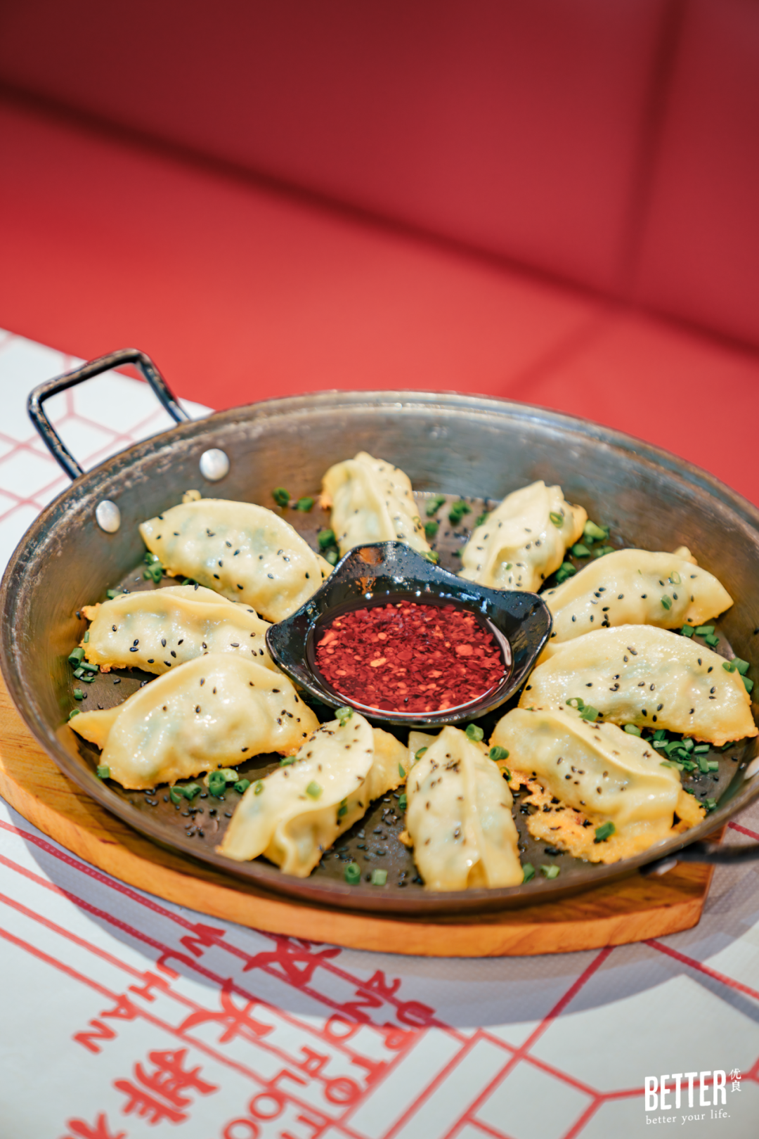 前厨做烧烤,后厨做热菜,刚端上来的锅贴还听得见铁板上的油滋滋冒响,葱花和芝麻让肉馅的香味更富有层次感,趁热蘸取中间的香辣酱,一口咬下去,酥脆的外皮与油润的内陷达到完美的平衡。