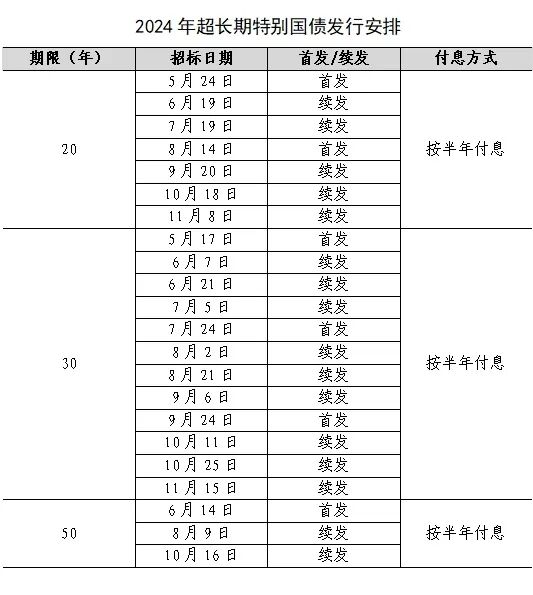 根据安排,超长期特别国债期限包括20年期、30年期、50年期,都是按半年付息。其中,30年期最先将在5月17日发行。