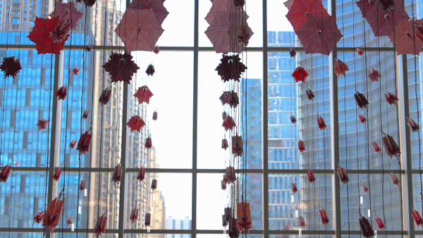 作品为美国数字艺术团队Hypersonic带来的国内作品首展,灵感来自武汉的樱花,从穹顶垂落的樱花瓣会随着场内光线的变化不断开合,时间的流动在花开的一瞬间变得具象。