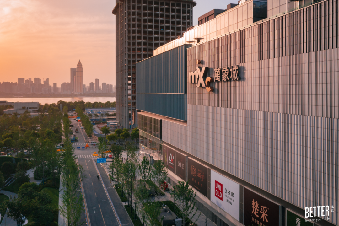 透过云霞的光,把高耸的玻璃幕墙擦成耀眼的暖橘,拔地而起的武昌万象城发着光,好似与咫尺的长江、头顶的碧空共一色。
