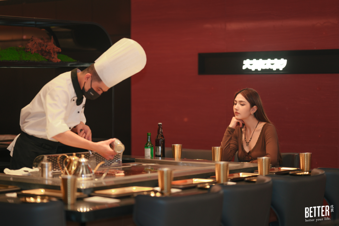 从上海餐饮界“卷”出来的日式铁板烧大神太神(武汉首店),一边吃安格斯战斧牛排,一边看厨师的桌边火焰show,滋味和香气全都钻进心里。