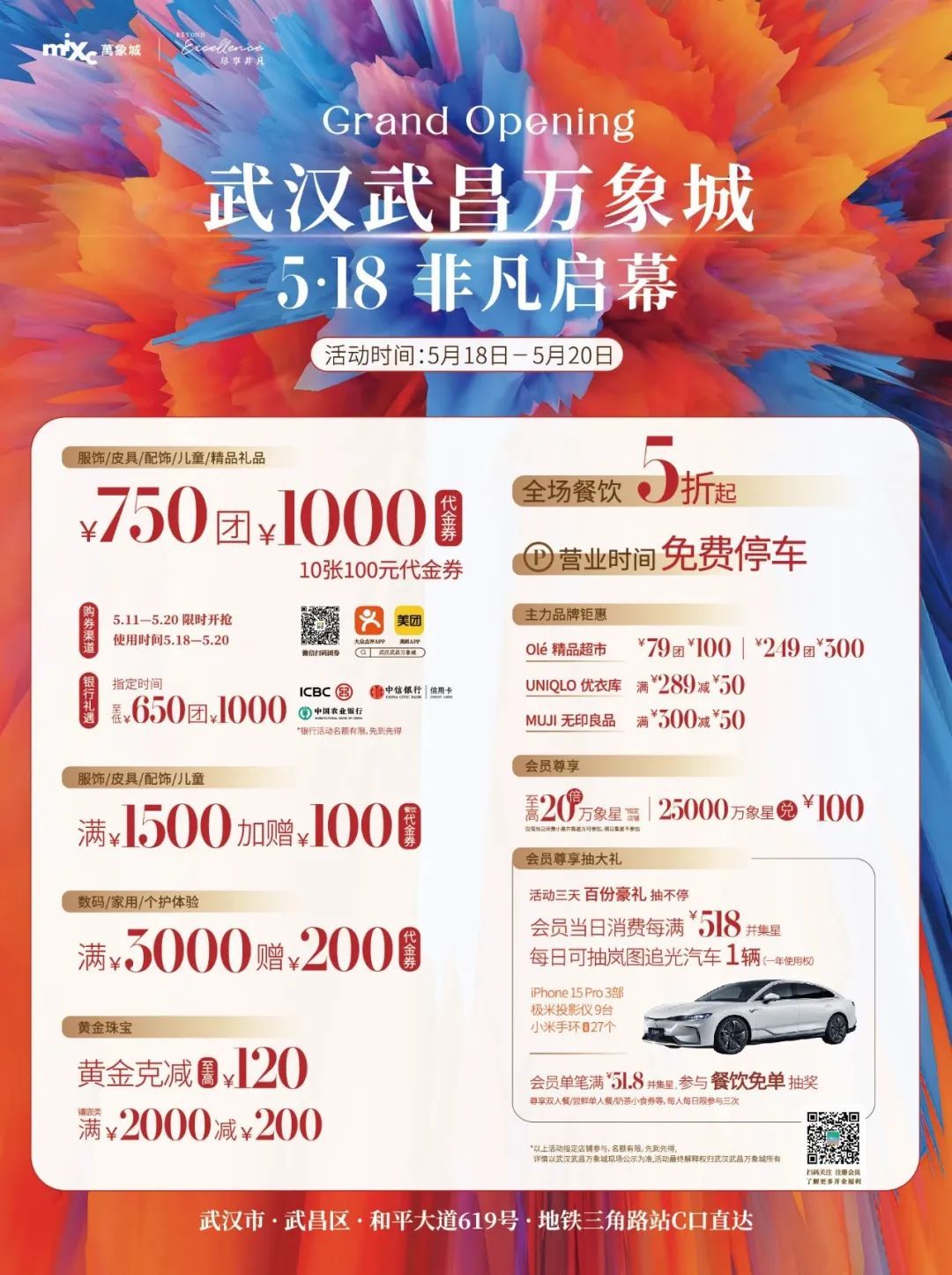 为了让你买买买得更开心,这次武昌万象城相当的大方,开业直接砸了12重豪礼,全场餐饮五折起、750团1000元、银行礼遇、万象星当钱花、满1500赠100、免停、打车券……