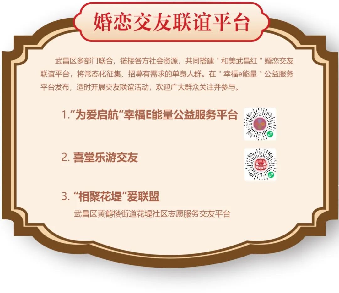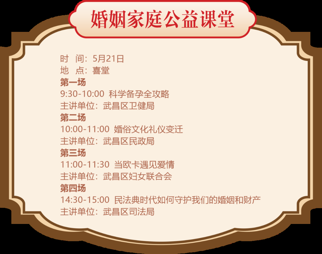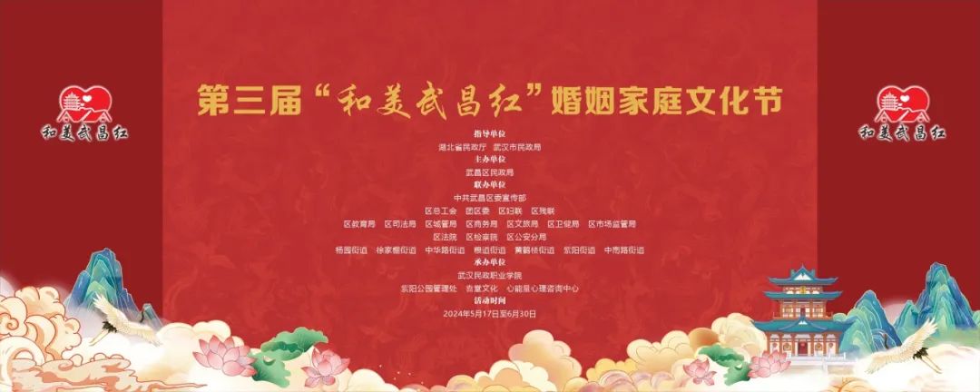 第三届“和美武昌红”婚姻家庭文化节于5月17日至6月30日期间热烈绽放,将有一系列精彩活动轮番呈现,带您一起感受“契”文化、“喜”文化、“家”文化的深厚内涵。