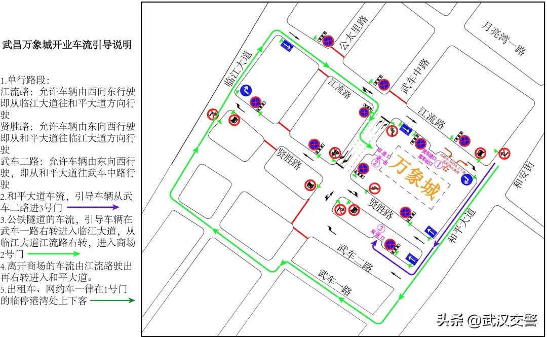 江流路由西向东设置单行(由临江大道往和平大道方向),贤胜路由东向西设置单行(由和平大道往临江大道方向),武车二路由东向西单行(由和平大道往武车中路方向)。