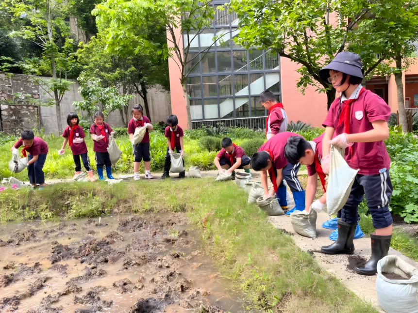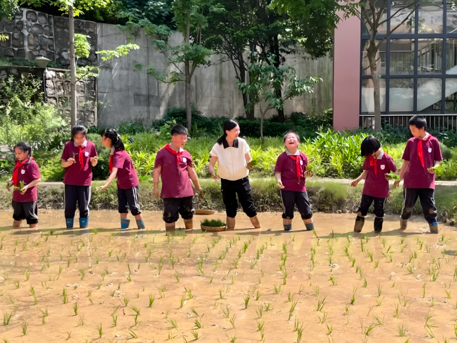 课间十分钟,与自然相伴!武昌区珞珈山小学组织学生在劳动实践基地——时晷讲堂,体验“小小农夫”的田间忙碌。稻田边,学生们跟随老师为秧田撒施基肥。他们撸起袖子、卷起裤脚、光着脚丫、埋头弯腰、手握秧苗,将一棵棵小禾苗插进水田里。“虽然我满手都是泥,但是真的很开心!”大课间,孩子们挥洒汗水,收获快乐。与此同时,学校在教学楼特别设置了农耕文化宣传栏、充满创意的“睛彩田野远眺墙”,为学生的课间休息增添了别样的自然趣味。