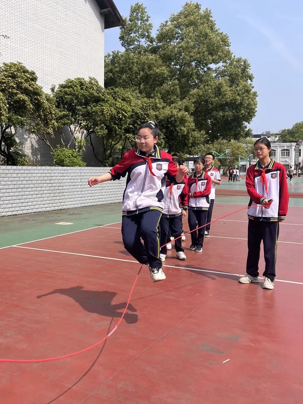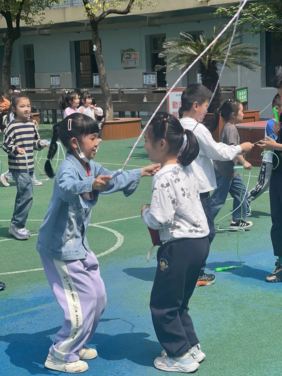 武昌区育红小学鼓励孩子们单人、双人跳短绳,以班级为单位跳长绳、跳皮筋。同伴之间玩纸飞机,开展老鹰抓小鸡、木头人等文明、安全的课间游戏。孩子们玩得开心,同伴间越发团结、亲密。