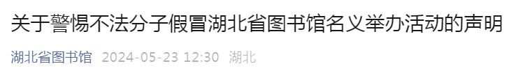 近日,有不法分子假冒湖北省图书馆名义,面向广大家长、学生和老师举办“语言文字赋阅读教育·营造阅读素养新样态”线上直播公益讲座等活动。对此,郑重声明如下: