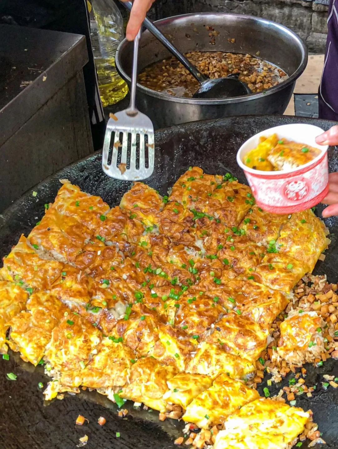 将绿豆和糯米磨成浆,然后在平底锅中将浆摊成薄饼,待其凝固后,再加入调料和佐料,色泽金黄,口感鲜美,真不愧是武汉三绝之一。