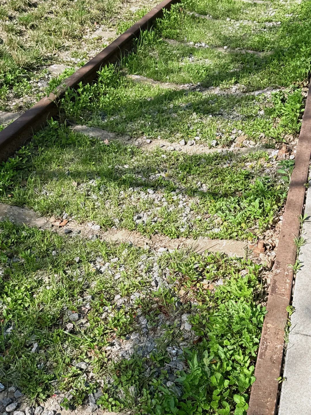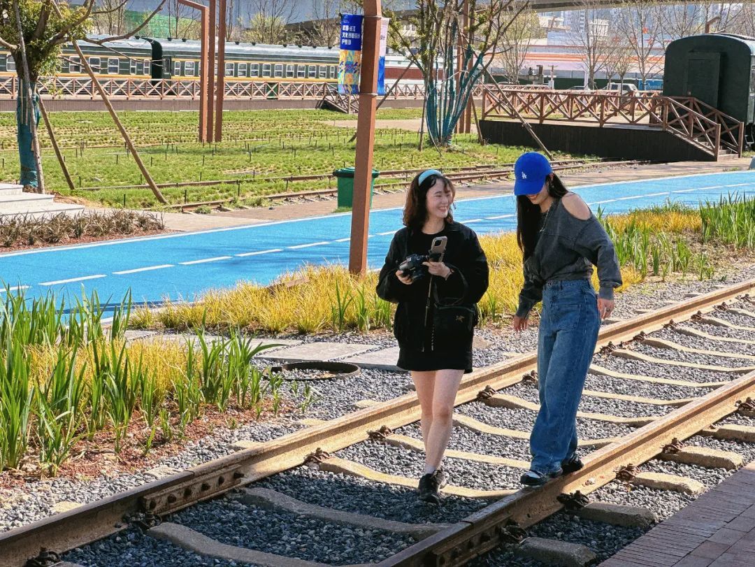 旧铁轨旁边还有杂草野花,风一吹都轻柔摇曳起来,游人穿梭其中,好像在郊野微度假,休闲又浪漫。