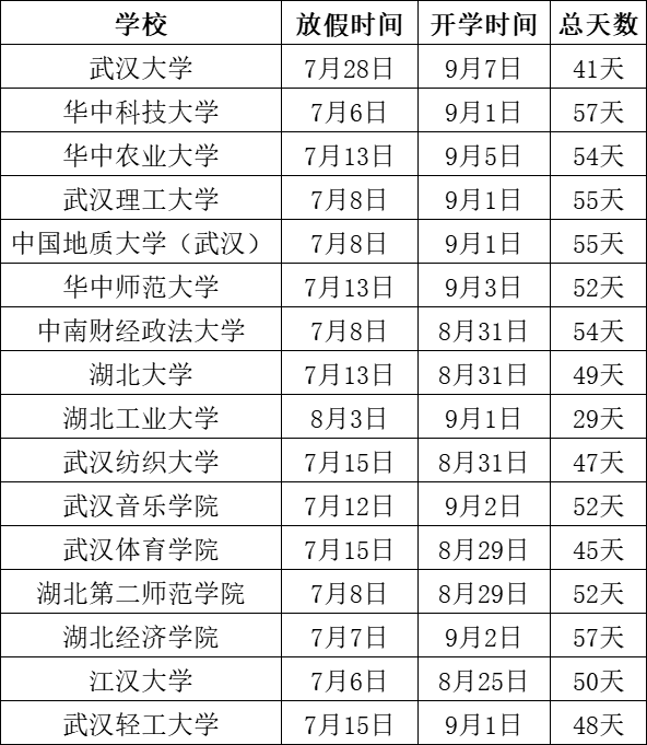 (信息来源各高校校历,具体放假时间以学校通知安排为准)