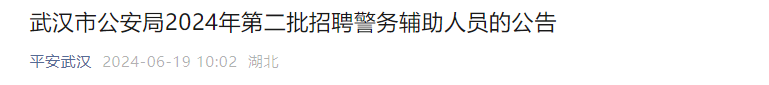 报考人员于2024年6月19日起,在武汉市公安局官方网站(http://gaj.wuhan.gov.cn)、武汉市公安局“平安武汉”官方微信公众号(pinganwuhan001)查询招聘信息。相关招聘人数、资格条件等详见附件1。