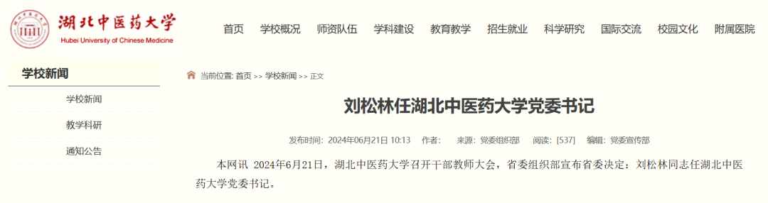 2024年6月21日,湖北中医药大学召开干部教师大会,省委组织部宣布省委决定:刘松林同志任湖北中医药大学党委书记。