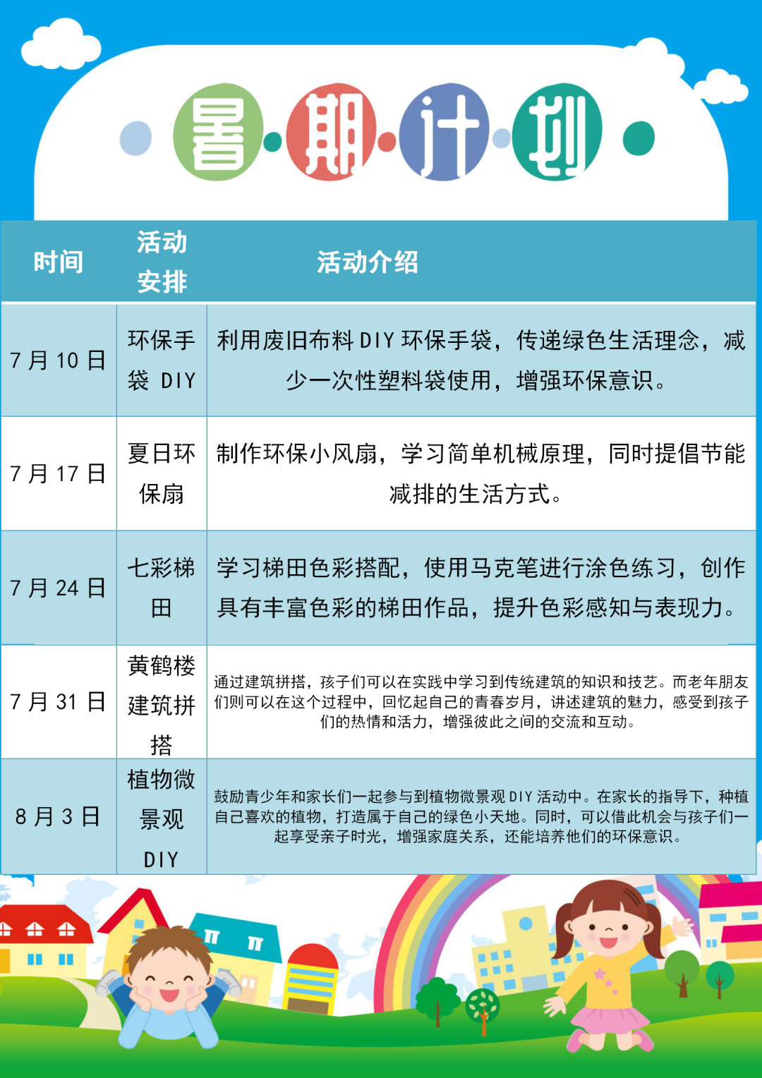 本次暑期社区青少年环保DIY活动,集创意、环保、实践于一体,亮点纷呈。精心策划了环保手袋DIY、夏日环保扇制作,引导青少年通过巧手将废旧物品转化为实用又时尚的环保艺术品,既培养了他们的动手能力,又深化了环保意识。七彩梯田建筑拼搭活动将激发青少年的空间想象力,而植物微景观DIY则让他们亲近自然,体验绿色生活的乐趣。这些活动不仅让青少年度过一个充实而有意义的暑假,更将成为推动社区绿色发展的重要力量。