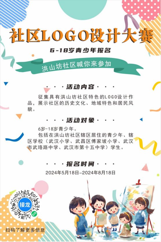 为进一步营造洪山坊社区与辖区青少年共同成长的和谐氛围,展示社区的历史文化、地域特色及居民风貌,现面向6-18岁的青少年开展LOGO设计活动。通过这一活动,我们期望激发青少年的创造力,培养他们的社区归属感,提升社区“筑梦成长·青春飞扬”项目的知晓度和影响力,形成鲜明统一的品牌传播形象,同时选拔出能够代表洪山坊社区特色的LOGO设计。