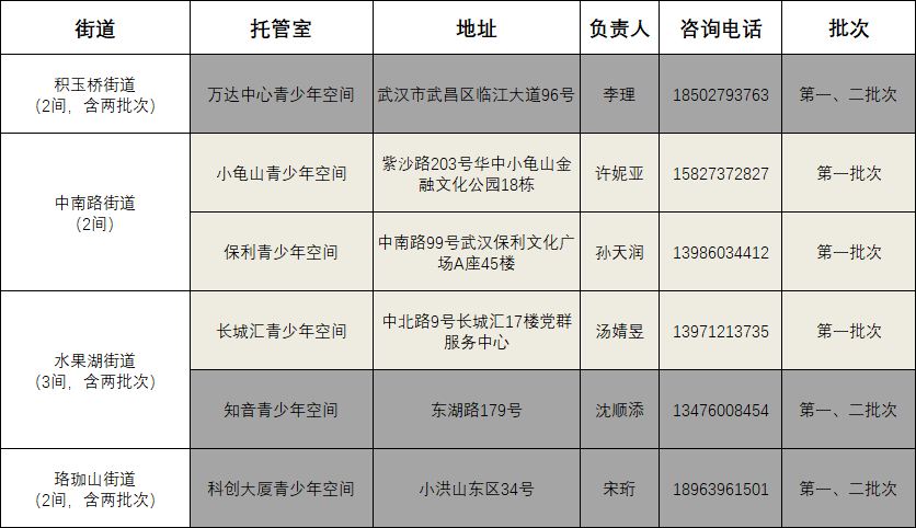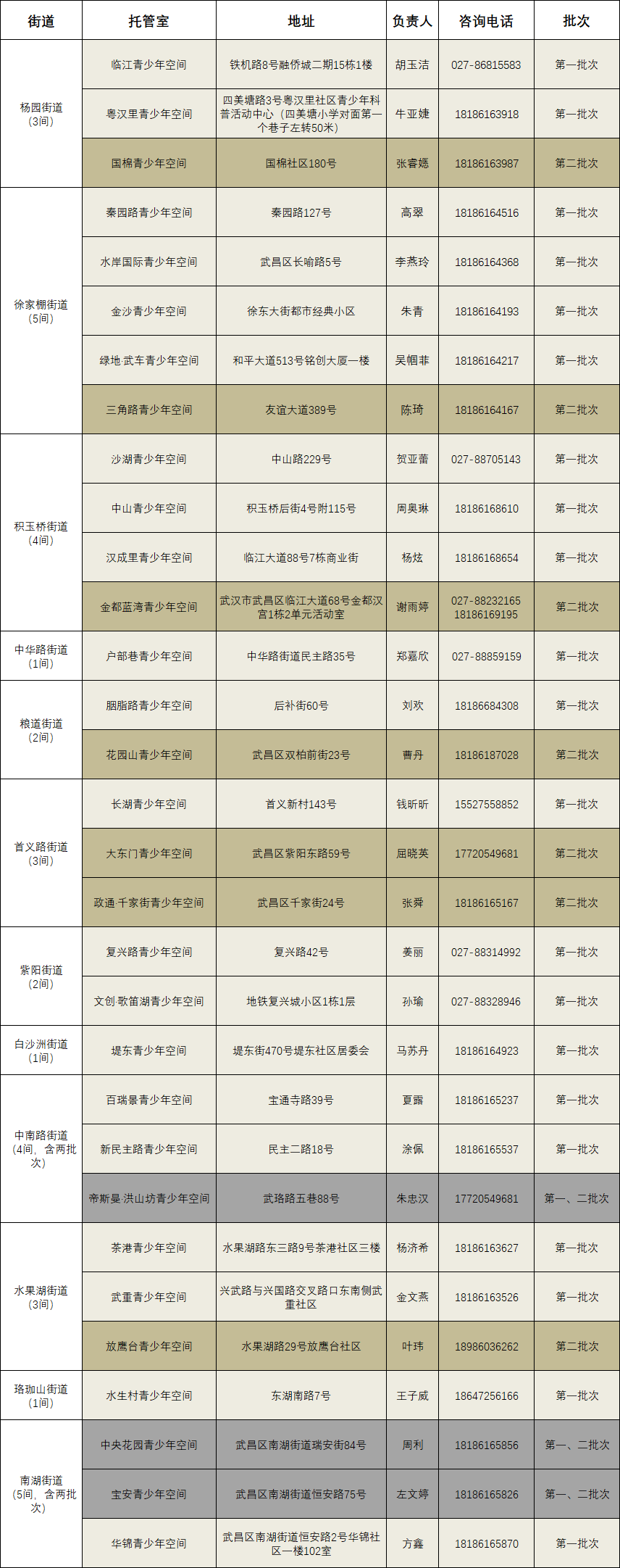 2、绿地·武车青少年空间、帝斯曼·洪山坊青少年空间、政通·千家街青少年空间、文创·歌笛湖青少年空间和德成·武重青少年空间5间托管室为“社区+楼宇”托管室。