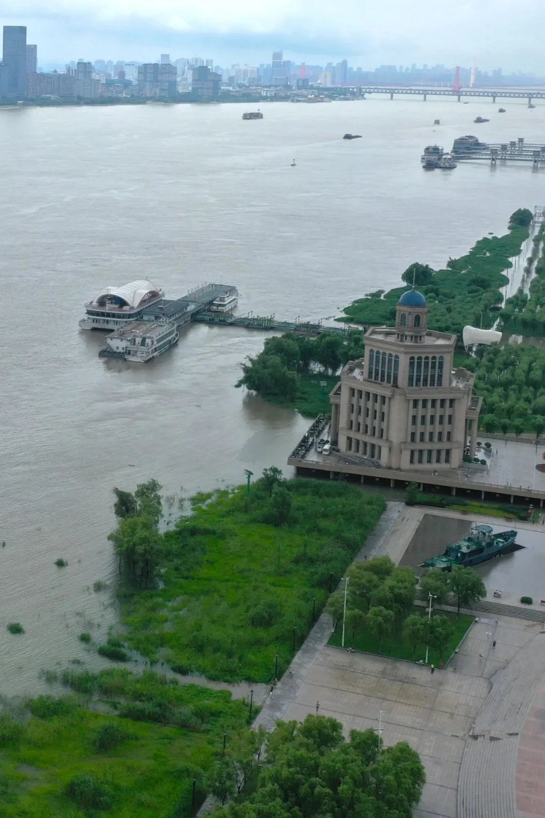 △武昌江滩斜坡下的护栏已几乎被江水淹没(图/武汉江滩,拍摄于6月28日)