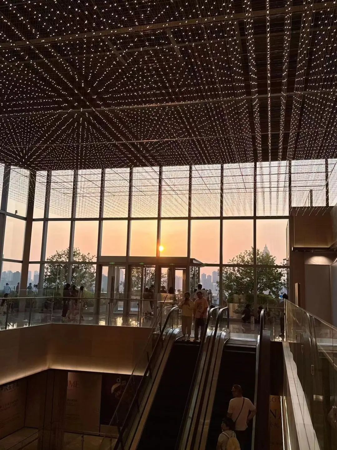 由美国艺术家团队Hypersonic定制的国内首件动态艺术雕塑“霞光绽放Twilight Blossom”悬挂于武昌万象城L3的艺术连廊中。