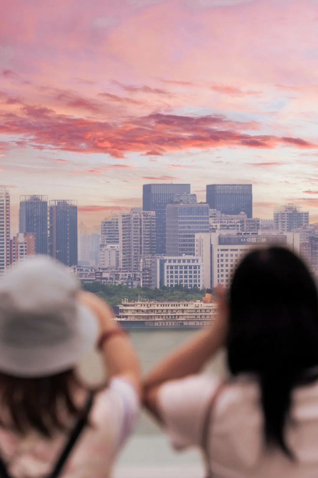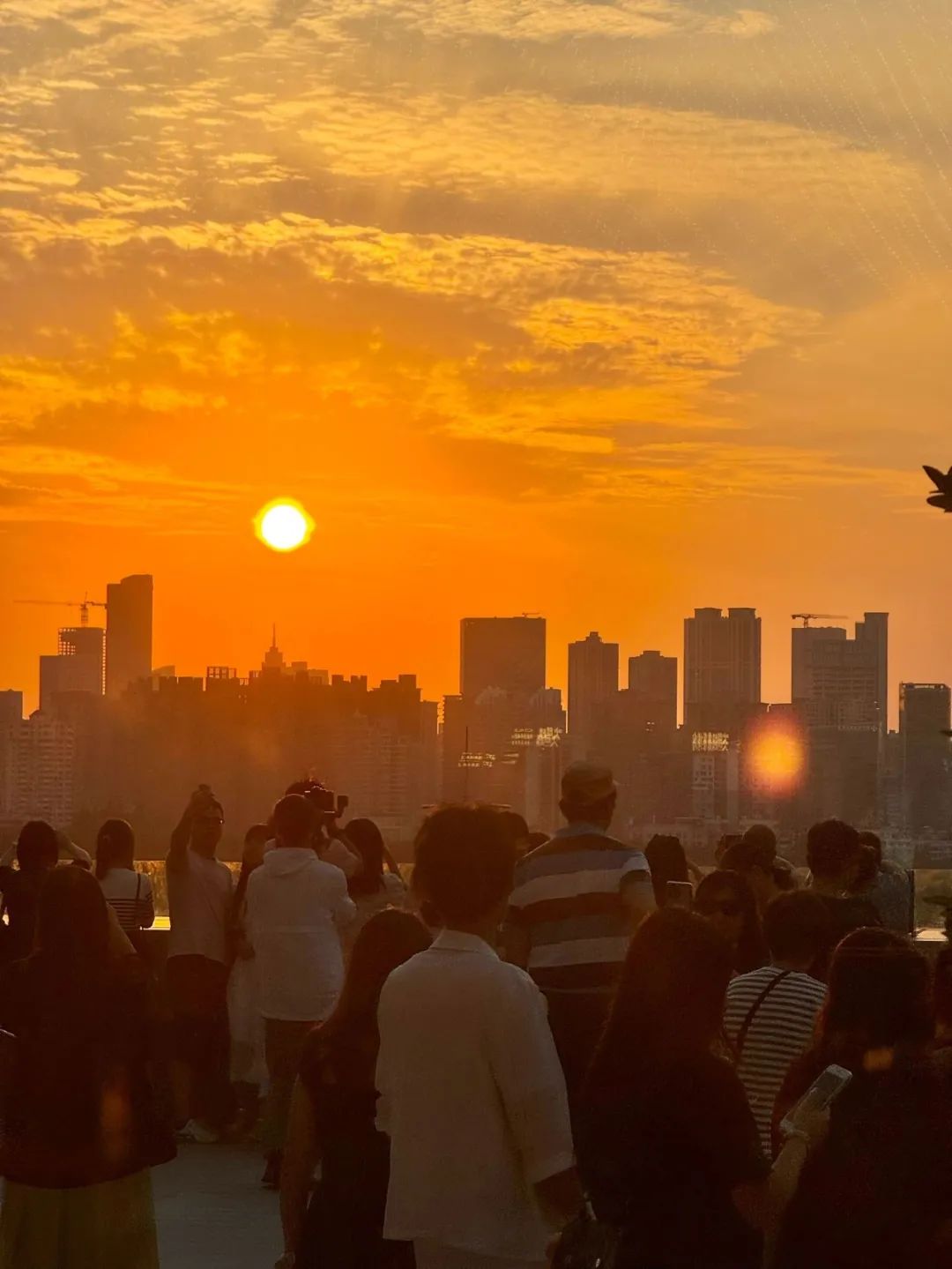 一颗“咸蛋黄”慢慢由橘黄变橙红,连着光影洒向江水,波光粼粼,城市大片限时“放映”,让人沉醉其中,流连忘返。
