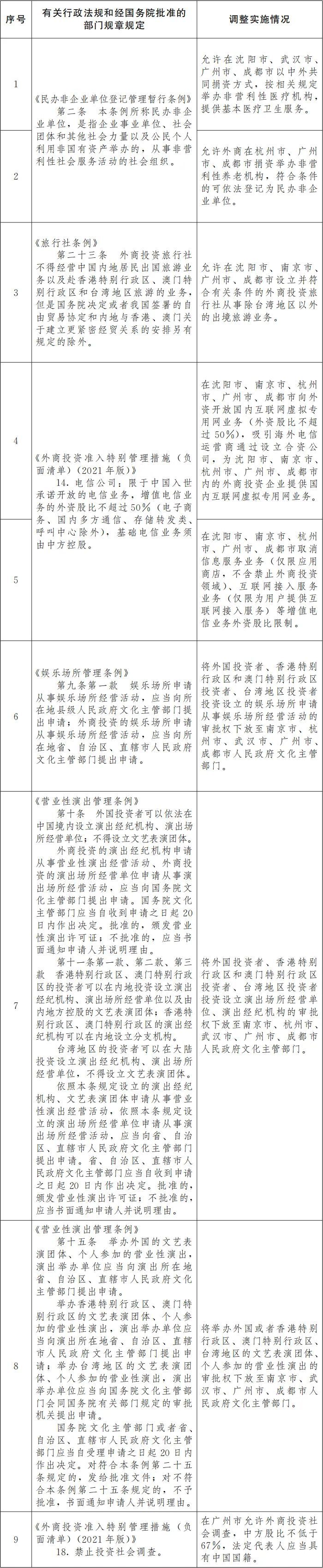 7月11日,中国政府网发布《国务院关于同意在沈阳等6个城市暂时调整实施有关行政法规和经国务院批准的部门规章规定的批复》,同意自即日起,在包括武汉市在内的6个服务业扩大开放综合试点城市,暂时调整实施有关行政法规和经国务院批准的部门规章规定,共涉及9个部分。