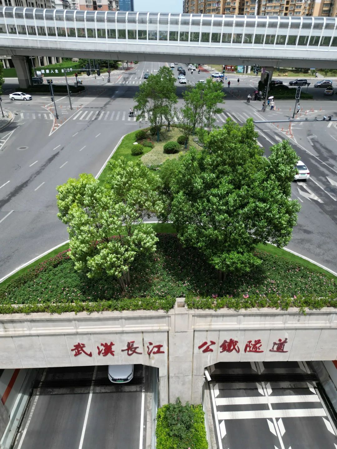 记者在友谊大道与秦园路交会处看到,路口南侧是长江公铁隧道的出入口顶部。这里两个小花坛经过改造后种植了3株朴树、2株樱花及小面积草坪。草坪上可以摆放时令花卉,使路口四季有花可赏。