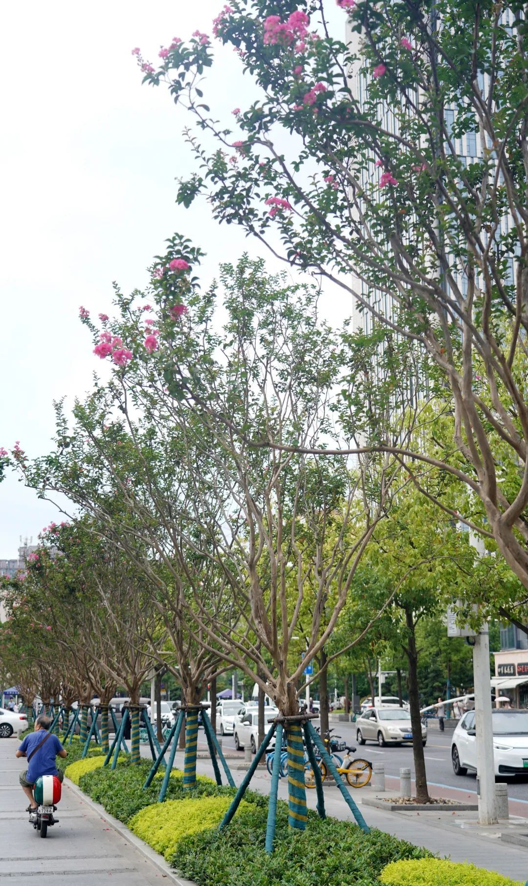 武昌区城管执法局与设计师充分沟通后,破除了一部分硬铺装,新修了两个带状花坛,种植了26株树高杆紫薇。这种紫薇的树干从距地面1.6米处分枝,不影响行人通行。
