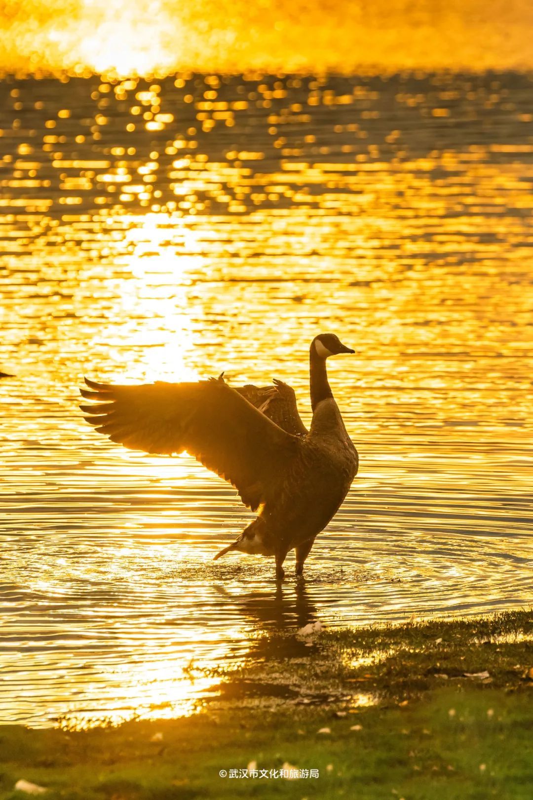 △武汉野生动物王国里的游子洞湖,生活着天鹅、鸳鸯等鸟类,金灿灿的日落余晖洒在水上,很美。