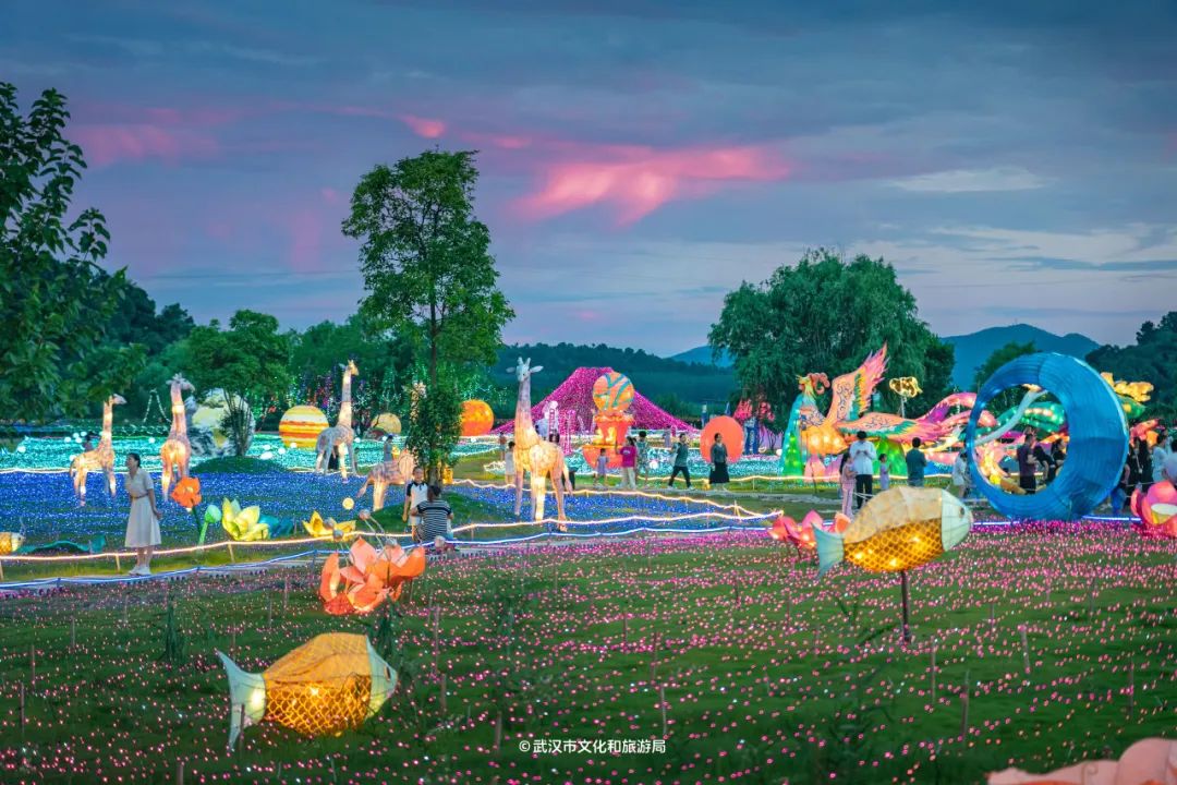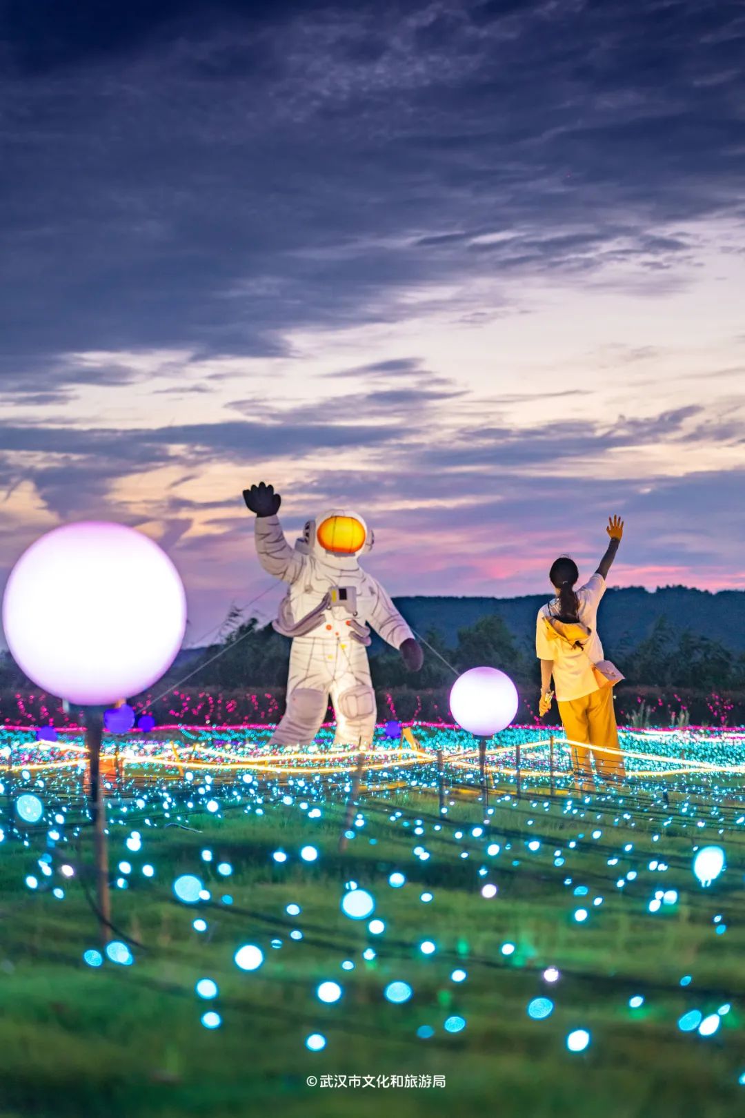 △22000㎡的绿草地上铺满璀璨灯光,长颈鹿/凤凰/地球/宇航员造型的花灯立在灯海里,19:30前后点亮。