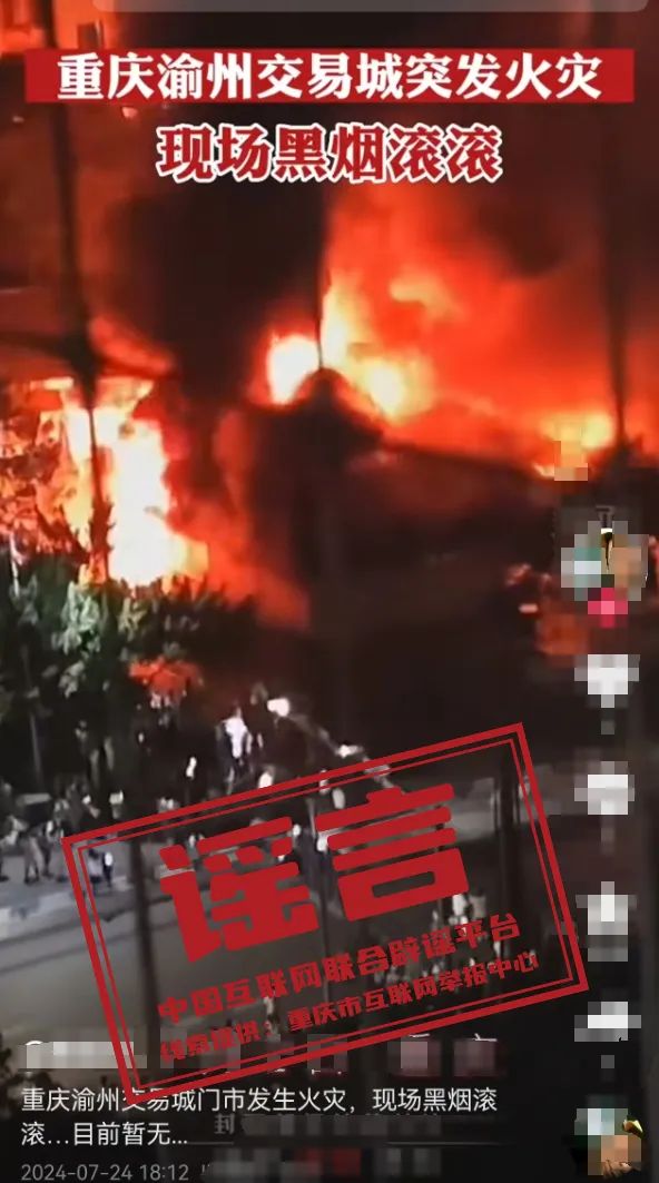 真相:7月25日,网上一则“仓山万达(王庄世欧广场)被淹”的视频,引发关注。经福建省福州市联排联调中心核查,网传视频为往年的旧视频,其所在位置也并非仓山万达,实际位于王庄世欧广场及其周边。福州市晋安区有关部门进行现场勘察,证实当地一切正常,并无明显积水。仓山万达广场也无明显积水。网传视频为不实信息。(来源:“福建辟谣”微信公众号) 谣 言 重庆渝州交易城突发火灾?